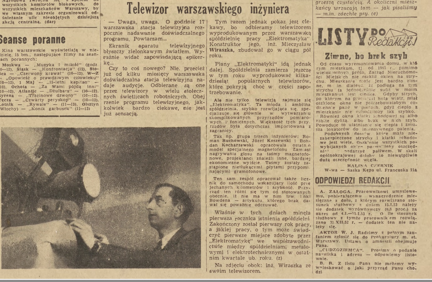 W "Życiu Warszawy" z 16 lutego 1953 r. znajduje się dość obszerny artykuł opisujący telewizor konstrukcji inż. Mieczysława Wiraszki. Sądząc po zdjęciu i opisie, telewizor był wyposażony w lampę oscyloskopową, a więc