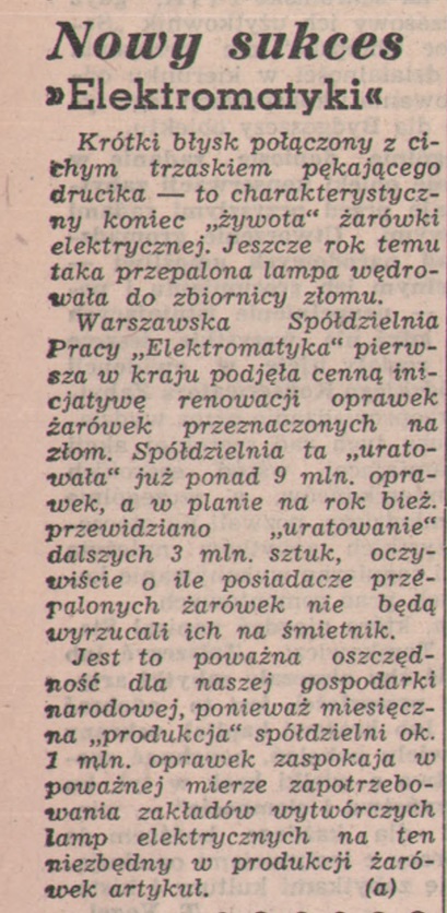 Niedługo później, bo już 13 listopada 1954 "Ilustrowany Kurier Polski" pisał o oprawkach żarówek, które odzyskiwała "Elektromatyka"