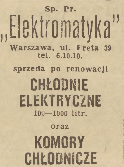 W "Życiu Warszawy" z dn. 16 maja 1955 r. ukazuje się ogłoszenie o chłodniach i komorach chłodniczych, które po renowacji oferowała spółdzielnia "ELektromatyka".
