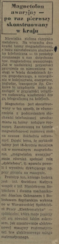 "Głos Koszaliński" z 2 listopada 1954 r. donosił o kontrukcji magnetofonu awaryjnego, zbudowanego przez "Elektromatykę".