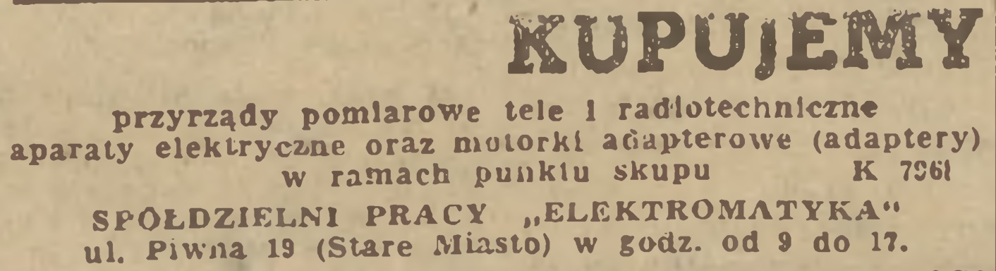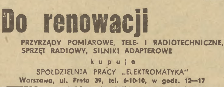W ogłoszeniu z 22 lutego 1955 r. znajdziemy z kolei informację o tym, że "Elektromatyka" skupuje do renowacji różne przyrządy i podzespoły.