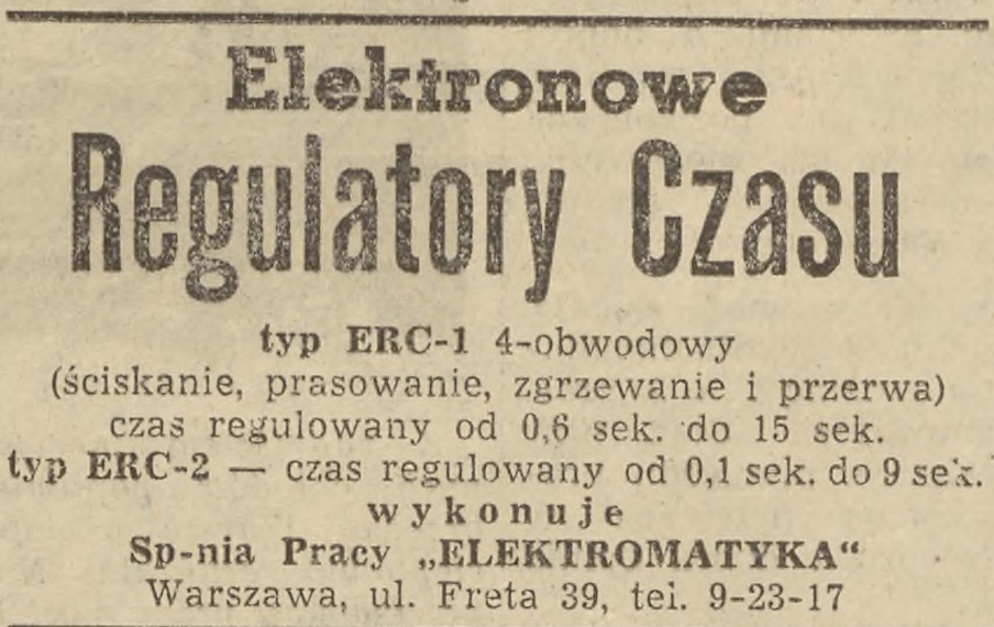 19 sierpnia 1957 r. w "Życiu Warszawy" znalazła się reklama elektronowych regulatorów czasu, produkcji "Elektromatyki".