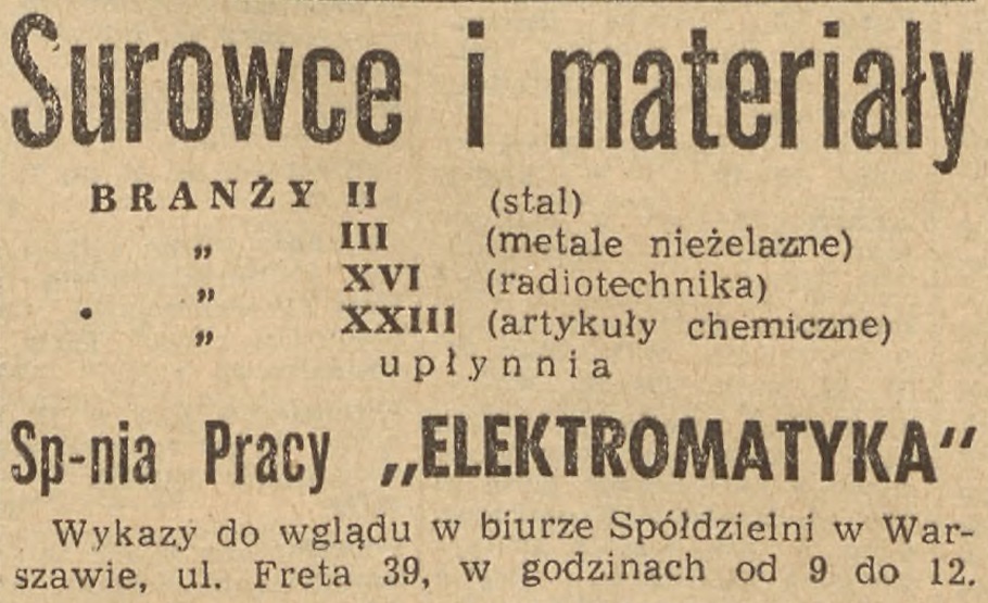 25 listopada 1957 w "Życiu Warszawy" zamieszczono ogłoszenie dotyczące upłynniania niektórych materiałów znajdujących się w posiadaniu "Elektromatyki".