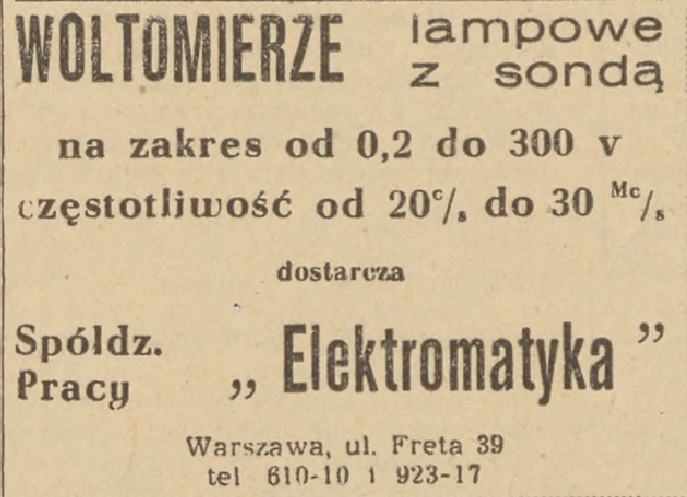 W "Życiu Warszawy" z dn. 13 września 1956 r. zamieszczona jest reklama woltomierzy lampowych z sondą, które oferowała ówcześnie "Elektromatyka".