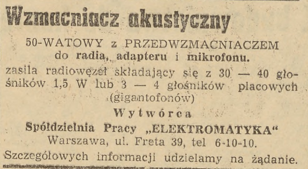 "Elektromatyka oferowała zresztą więcej urządzeń rozgłoszeniowych i wzmacniających, czego dowodzą poniższe dwa materiały prasowe.