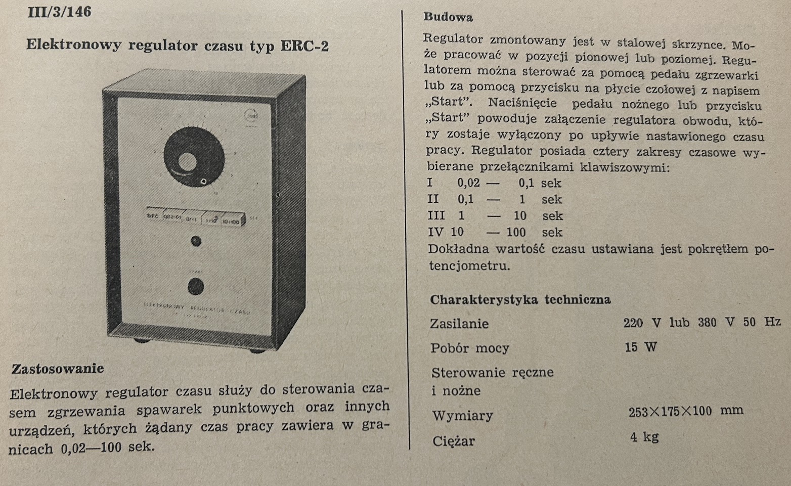 Elektronowy regulator czasu służył do sterowania czasem pracy zgrzewarek punktowych i innychy urządzeń, których żądany czas pracy zawierał się między 0,02 a 100 s.