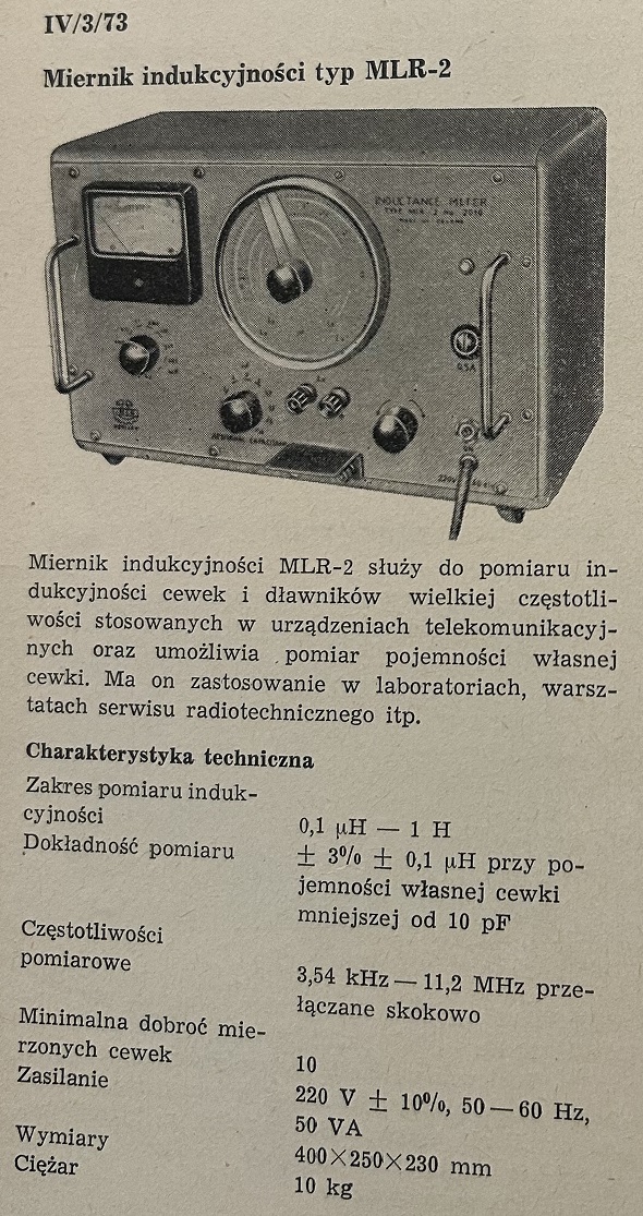 Miernik indukcyjności MLR-2 umożliwiał pomiar indukcyjności w zakresie 100 nanohenrów- 1 henr.